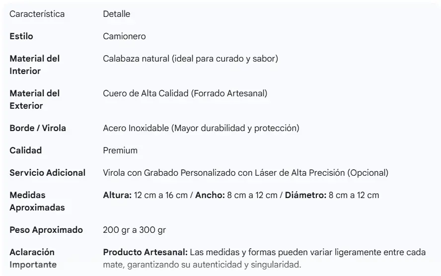 ¡Eleva tu ritual matero a un nuevo nivel! Este no es un mate cualquiera, es una pieza de calidad Premium diseñada para acompañarte en cada momento. Disfruta del sabor auténtico de la yerba en un mate estilo Camionero que combina la tradición de la calabaza con un diseño robusto y elegante. Su interior de calabaza natural garantiza una curación perfecta y una experiencia de sabor inigualable, mientras que el forrado de cuero de alta calidad proporciona un agarre cómodo y una durabilidad excepcional.